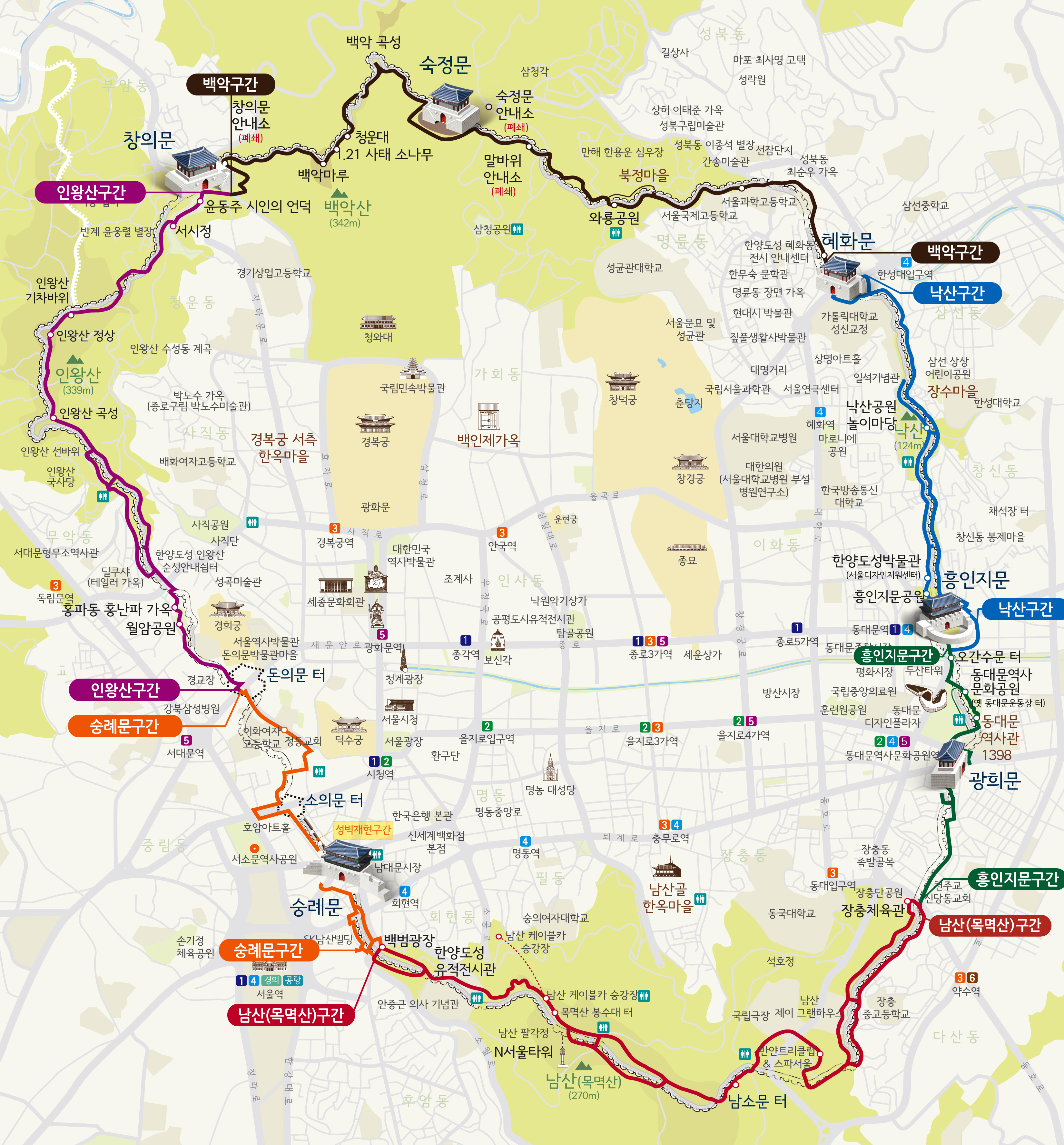 서울 도심 한복판을 휘감고 있는 서울 성곽길은 단순한 산책로를 넘어, 조선의 역사와 자연, 그리고 현대 도시 풍경이 공존하는 특별한 길입니다. 이 글에서는 한양도성의 4대 주요 구간(북악, 낙산, 남산, 인왕)을 중심으로 산책코스를 소개하고, 각 구간마다 만날 수 있는 전망 명소와 역사 유적들을 함께 안내해드립니다.