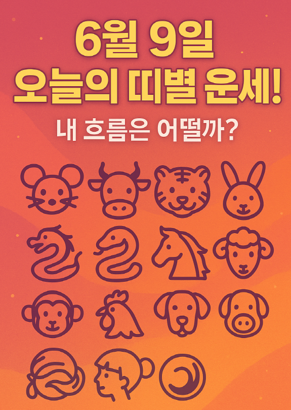 하루를 시작하기 전, 오늘 나의 운세가 어떤 흐름일지 궁금하신가요? 2025년 6월 9일은 음력으로 5월 14일, 월요일입니다. 새롭게 한 주를 여는 날인 만큼, 띠별 운세를 참고해 오늘의 방향을 잡아보세요!