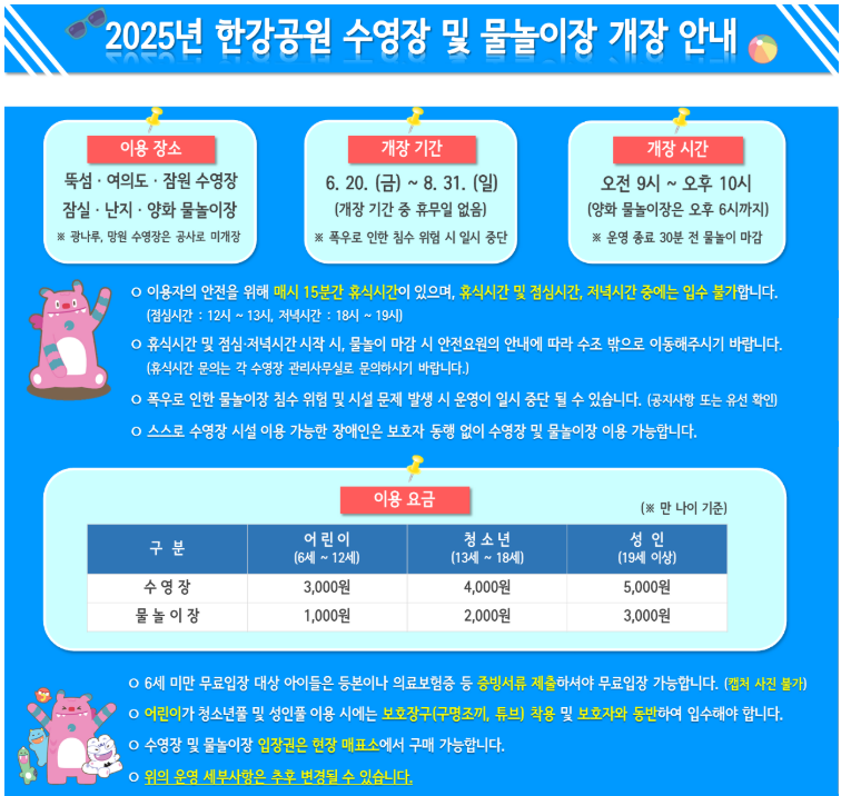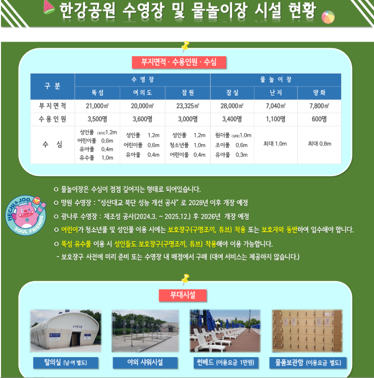 - 📍 운영 장소: 여의도, 잠원, 뚝섬, 난지, 잠실, 양화 물놀이장(광나루, 망은 수영장은 공사로 미개장)