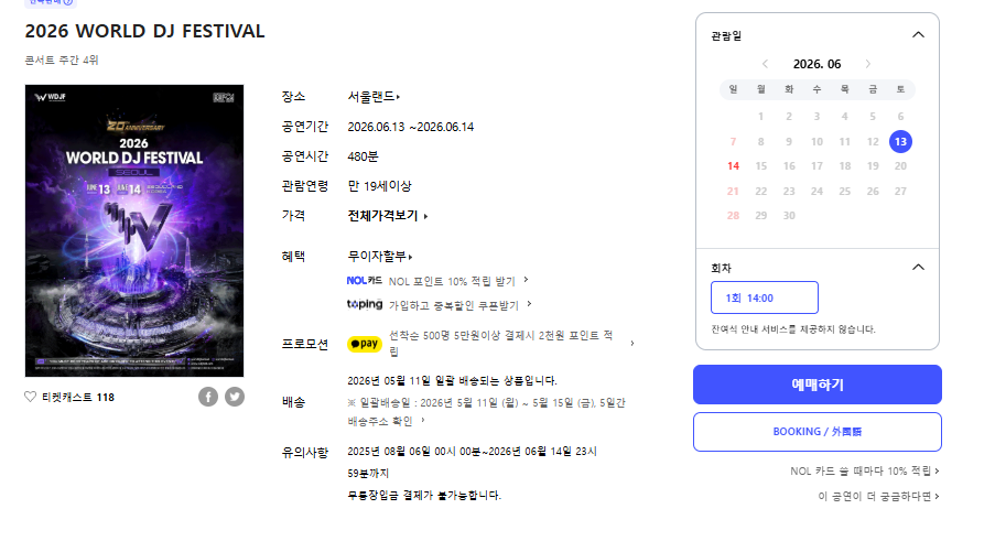 2026 월드 DJ페스티벌 티켓은 공식 홈페이지와 인터파크, 네이버예약 예매할 수 있습니다.
